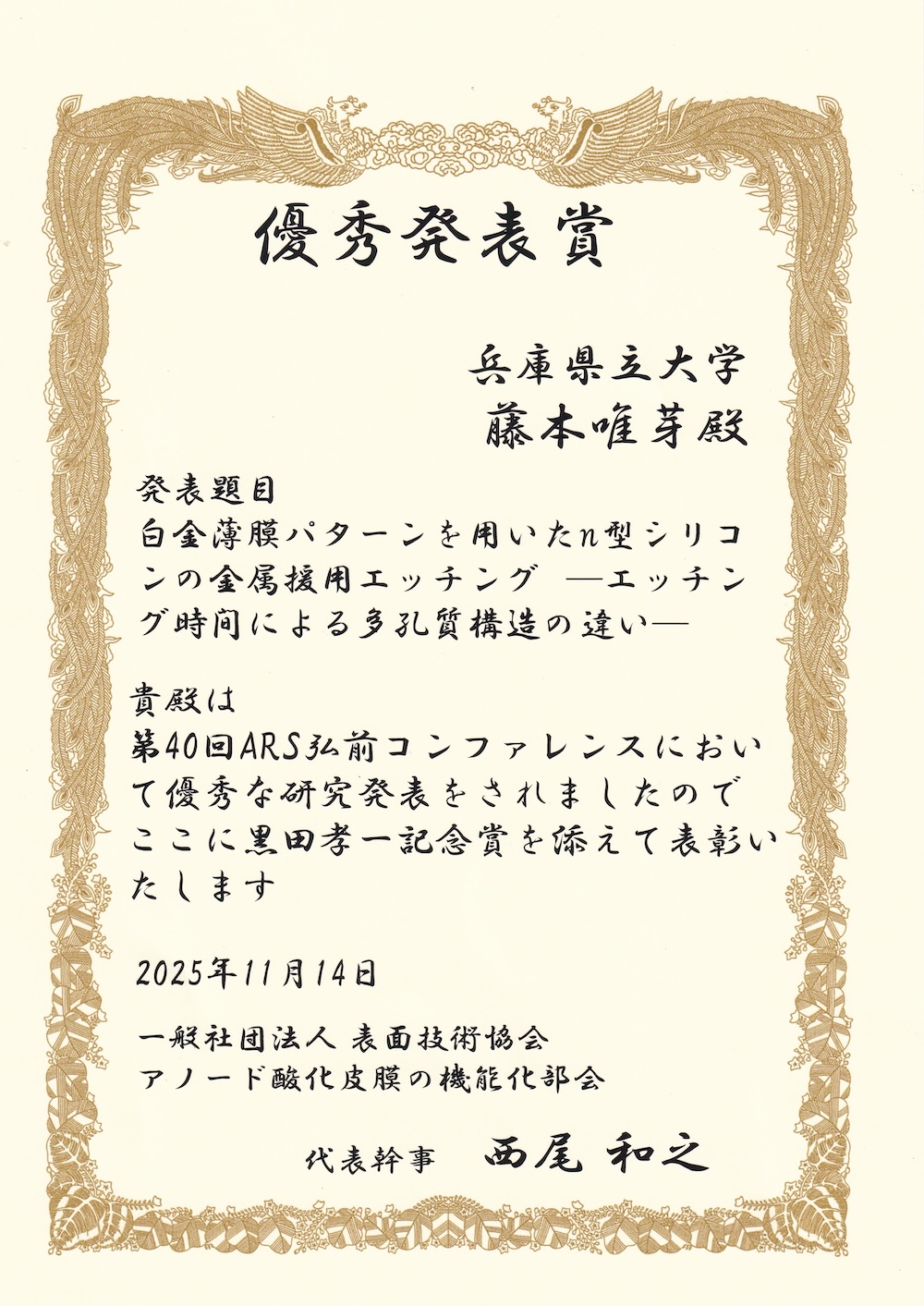 応用化学工学科4年の藤本唯芽さんが2025年11月13日~14日に弘前パークホテルで開催された第40回ARS弘前コンファレンスで優秀発表賞を受賞しました。ARSコンファレンスは、アノード酸化の基礎および応用に関する研究発表会で、22件の応募の中から特に優れた3件のポスター発表に対して本賞が授与されました。発表題目は「白金薄膜パターンを用いたn型シリコンの金属援用エッチング ―エッチング時間による多孔質構造の違い―」で、シリコン表面および断面の構造観察に加え、紫外光照射による可視発光領域の観察やシリコンの電極電位測定を行い、エッチングの挙動を考察したものです。(表彰状)
