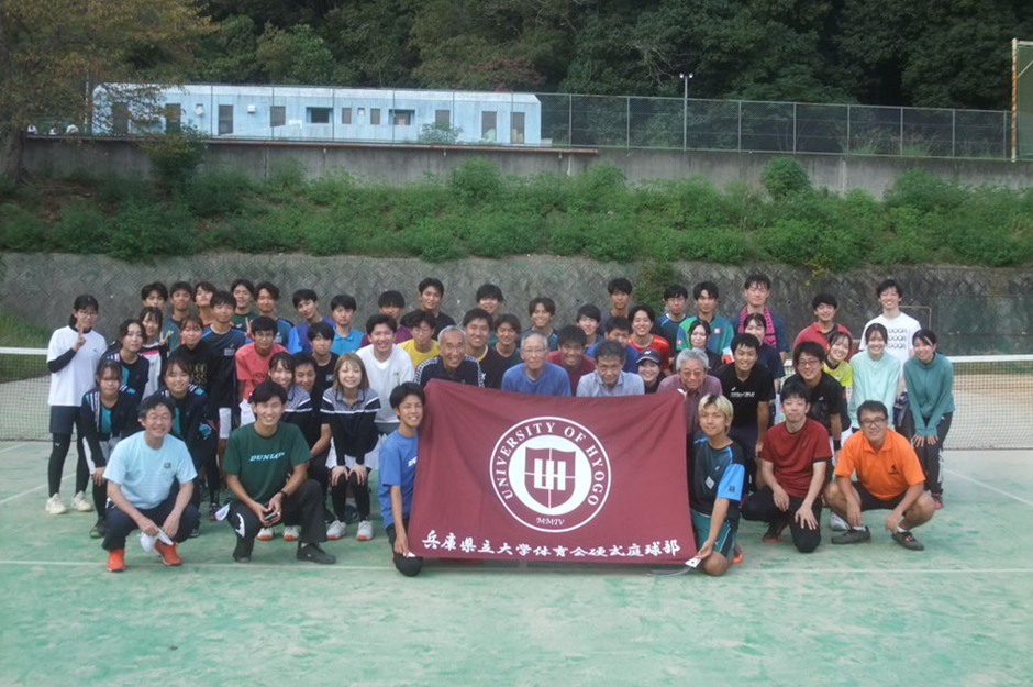 今年度も恒例の秋季OB会が10月18日に開催され、OB 31名の参加がありました。幸い天候に恵まれ、快適な気候の下テニスを存分に楽しむことができました。 青春時代を共に過ごした親友のような存在である書写のクレーコートは、予測不能なイレギュラーバウンドでOBを手厚く迎え入れ、毎年その対応に苦しむ姿が見られます。今年も多少のイレギュラーバウンドはありましたが、整備が進んだおかげで例年より頻度が減ったように感じられました。これは現役部員の努力の賜物であり、OBとして大変嬉しく思います。OB対現役部員の試合結果については、近年は強豪OBの参加が多く、現役部員を圧倒する場面が目立ちました。しかし今回は15勝13敗と僅差でOBの辛勝となり、ほぼ互角の戦いでした。特に下級生に有望な選手が多く、互いに切磋琢磨して力を伸ばしていけば、来年度の昇格も十分に期待できると感じています。テニスを楽しんだ後は会合を開き、リーグ戦の結果報告を受けました。残念ながら男女ともに4部の壁は厚く、昇格は叶いませんでしたが、この悔しさを糧に来年こそ飛躍してくれるものと信じています。なお、OBも有志で兵庫県市民大会に「兵県大OB」チームとして参戦を続けています。近年は好成績を残せていませんが、現役に負けぬよう日々努力を重ね、良い報告ができるよう励んでおります。