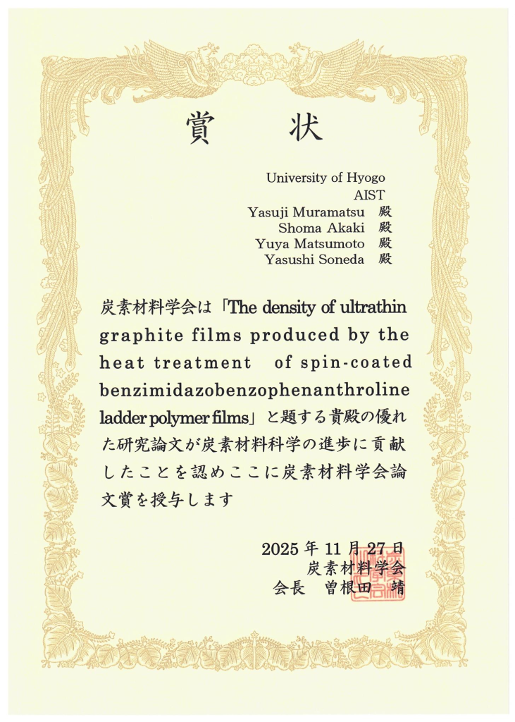 受賞論文のタイトルは”The density of ultrathin graphite films produced by the heat treatment of spin-coated benzimidazobenzophenanthroline ladder polymer films”で,Carbon Reports, 4, 234-239 (2025)に掲載されました。共著者は応用化学専攻博士前期課程を修了した赤木翔眞さんと松本侑也さん,並びに産総研エネルギープロセス研究部門総括研究主幹の曾根田靖博士です。本論文はグラファイト超薄膜の密度が膜構造の乱れに強く依存することを示し,この結果から炭素原子のX線質量吸収係数を正確に実験で決定することが可能となりました。これは炭素材料分野と放射光分野の異分野融合による重要な研究成果の創出です。(表彰状)