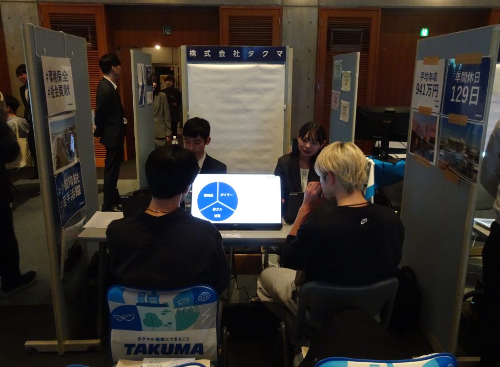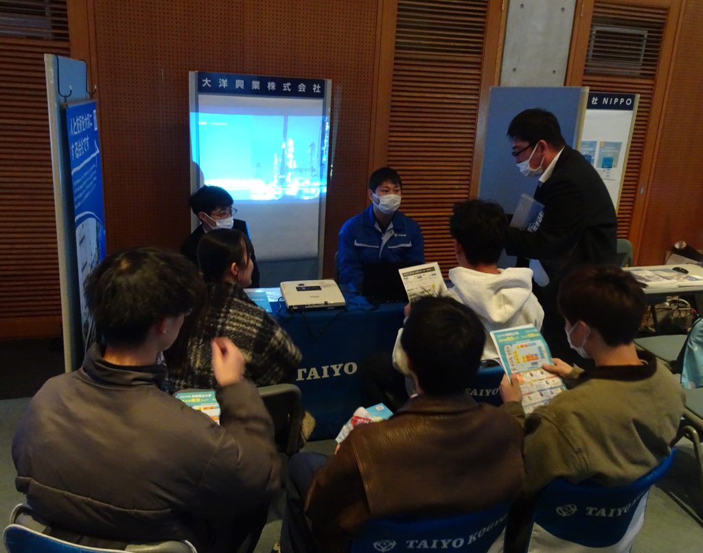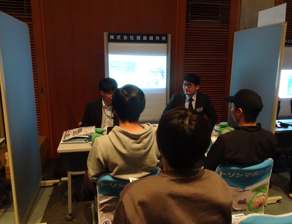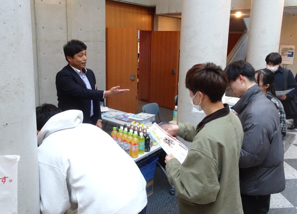 開催時間は前回同様、14:40-18:00まで OBOGの方が活躍されている企業を中心に、書写紀念会館にて開催しました。今回は日没が早く、寒い季節ということもあり参加学生は今までの半数程度に留まりました。途中で急遽、学生が多く居る学生会館2階に出向いて学生たちに呼びかける形で参加企業有志の方にPRして頂き、好評を得ました。