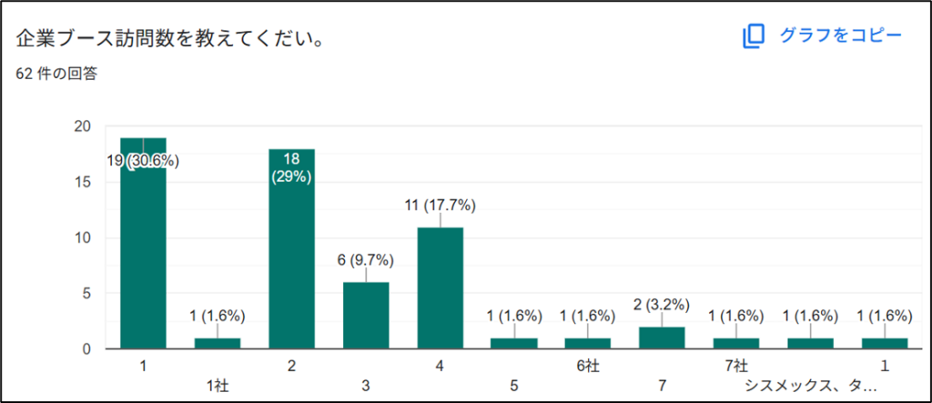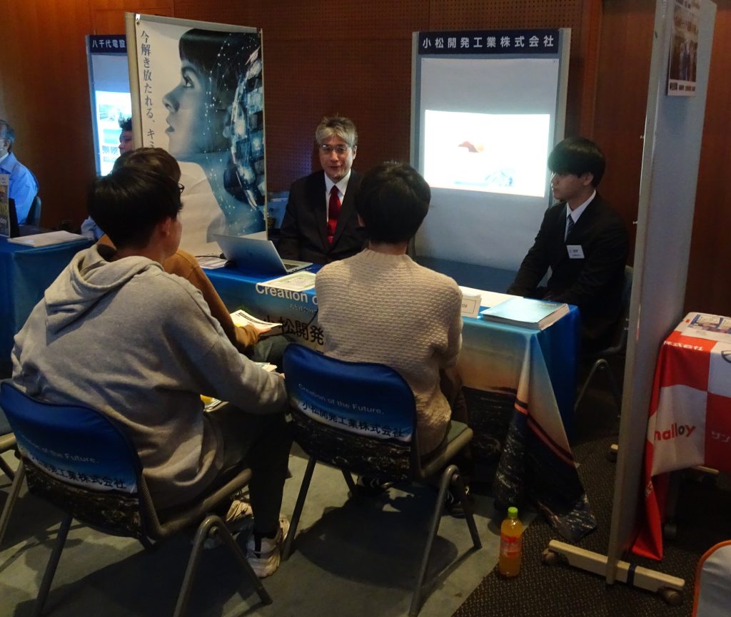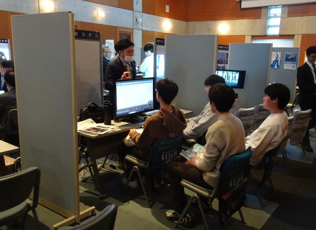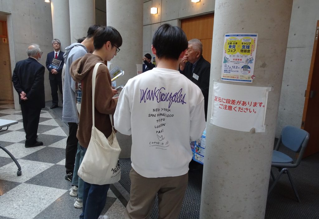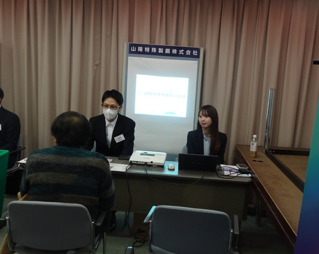 開催時間は前回同様、14:40-18:00まで OBOGの方が活躍されている企業を中心に、書写紀念会館にて開催しました。今回は日没が早く、寒い季節ということもあり参加学生は今までの半数程度に留まりました。途中で急遽、学生が多く居る学生会館2階に出向いて学生たちに呼びかける形で参加企業有志の方にPRして頂き、好評を得ました。