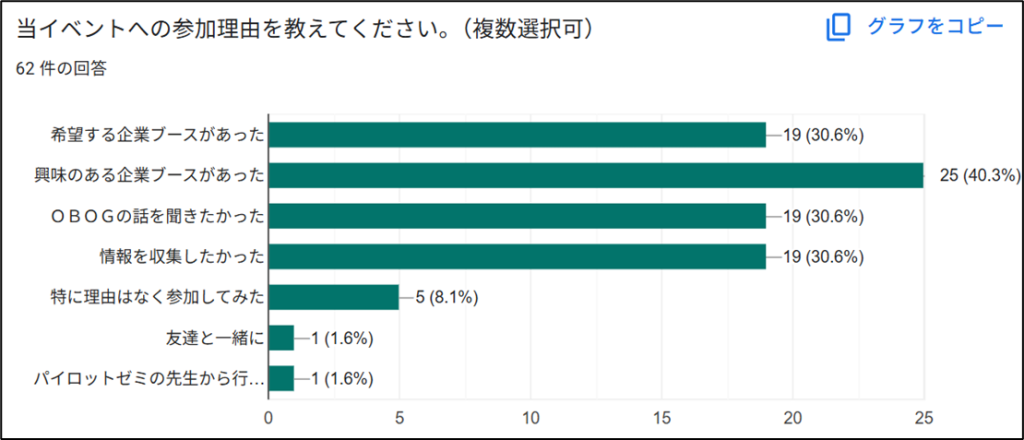 対象学生は就職活動中の3年生・大学院修士1年生としていますが、他の学年の学生も参加OKとしています。「事前登録」でドリンクに加えてグミ菓子の提供を前回に続いて実施しました。参加OBOGと語れる機会ですので次回は是非多くのご参加をお待ちしています。