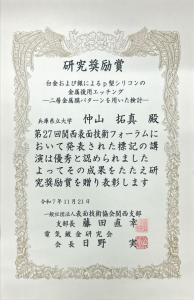 電気物性工学専攻,博士前期2年生の阿部 光希さん,岡本 昂大さんが,それぞれ 電気学会 関西支部 若手研究発表会奨励賞を受賞 2025年12月16日 最終更新日時 : 2025年12月16日 姫路工業倶楽部 これは,令和7年11月30日に開催された電気学会関西支部若手研究発表会におけるポスター発表が奨励賞に値すると評価されたものです。受賞者には賞状が授与されています。なお,各人の発表題目は以下の通りです。 阿部 光希: 「溶液中メチレンブルー分解におけるキャビテーションプラズマ放電路の影響」 岡本 昂大: 「背後電極を有するガラス上マイクロギャップ放電におけるガラス厚さの影響」 (表彰状(阿部さん)) (表彰状(岡本さん))