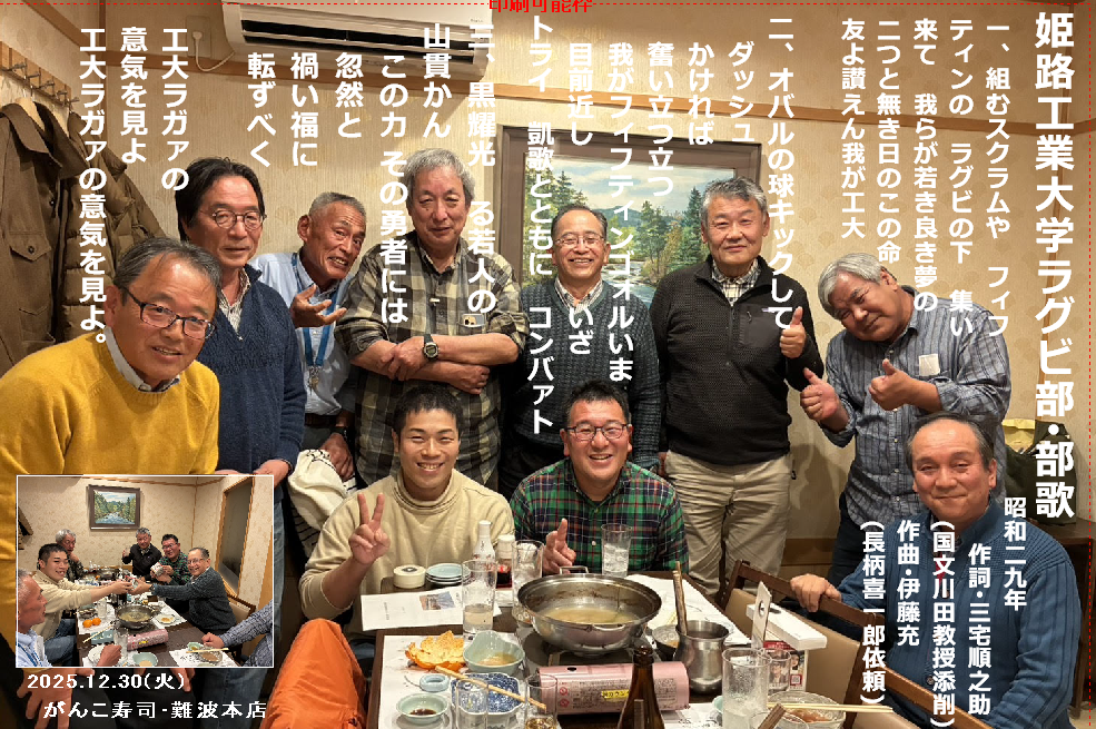'25.12.30(土)、姫路工業大学ラグビ-部(s55~60年代卒業OB&今回は中堅現役OBも招き)恒例のミニ忘年会を開催しました。