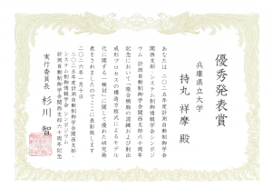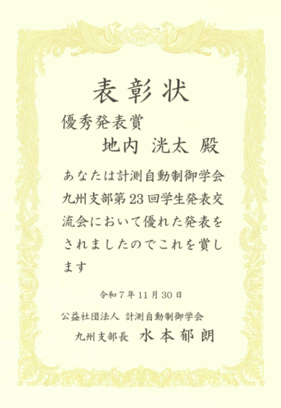地内洸太さん(工学研究科 機械工学専攻 博士前期課程2年)が,計測自動制御学会九州支部 優秀賞を受賞 2026年1月23日 最終更新日時 : 2026年1月23日 姫路工業倶楽部 受賞対象の研究題名は「閉ループ応答誤差に基づく周波数領域におけるロバスト2自由度PID制御器設計」です。地内洸太さんのデータ駆動制御をはじめとする今後の研究活動がますます期待されます。 (表彰状)