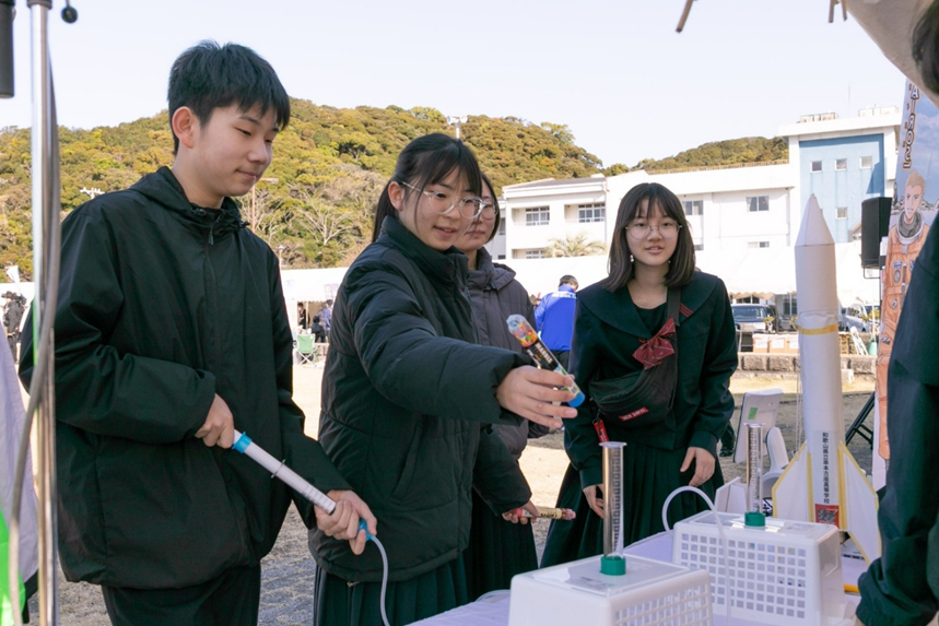 今回の展示は、和歌山県立桐蔭中学校・高等学校、和歌山県立串本古座高等学校と連携して行いました。桐蔭中学校・高等学校科学部の中学生16名が説明員となり、ロケットが飛ぶ仕組みのパネル展示や空気ロケットの発射体験などを行いました。体験コーナーでは多くの小学生が空気ロケットを飛ばし、ロケットが勢いよく上に飛び上がるたびに歓声が上がっていました。子どもたちが夢中になってロケットを飛ばす様子を見て、宇宙や科学への興味の入口になればと感じました。