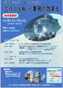 題目:兵庫県立大学 AI入門セミナー 「生成AIを用いた業務の効率化」日時:令和8年1月19日(月) 13:30~16:55場所:兵庫県立大学 新長田ブランチ セミナー室 申込み:チラシ(裏頁)のQRコードよりお願いしま […]